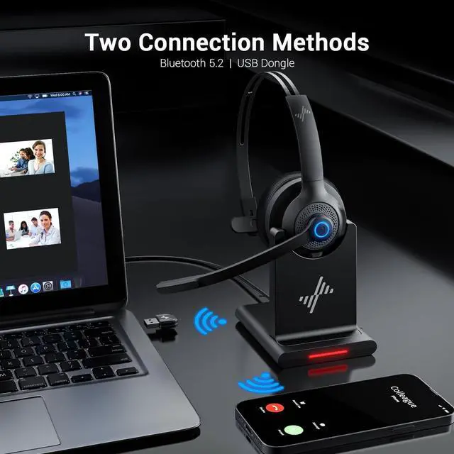 Bluetooth 5.2 ]: V 5.2 wireless headset with microphone for laptop allows for faster pairing speed, more secure and stable connection, lower latency, better audio quality, and longer battery life. With a wireless range of up to 10m/33ft, you can multitask with no cords hanging around, walk around without the phone, and remain connected with excellent sound. Not for desk phones or landlines ^^ [USB Adapter Plug and