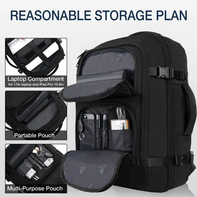 ^^ Well-Partitioned Storage: Large 40-liter capacity, two front pockets, side pockets and a 20-inch laptop pocket with foam padding, and a main compartment with mesh pockets and luggage compression straps to keep your travel gear organized and easier to find.