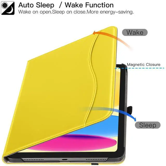 (Model Number: A2696/A2757/A2777) Not compatible with other iPad devices. Please check the model number of your iPad before purchasing. ^^ iPad 10th generation case with premium PU Leather exterior and anti-slip interior lining protects your iPad from shocks, drops and scratches. ^^ -The front cover is equipped with pockets for notes, cards, cash etc. External elastic band enhances magnetic closure. ^^ /Strong magnetic protective case makes it easy to wake or sleep your iPad, which can reduce battery drain for extending life. ^^ Multiple slots on the inside of the front cover can adjust your iPad to a comfortable viewing or typing angle, making you relax and entertain better. Full access to all controls and features without removing the case.