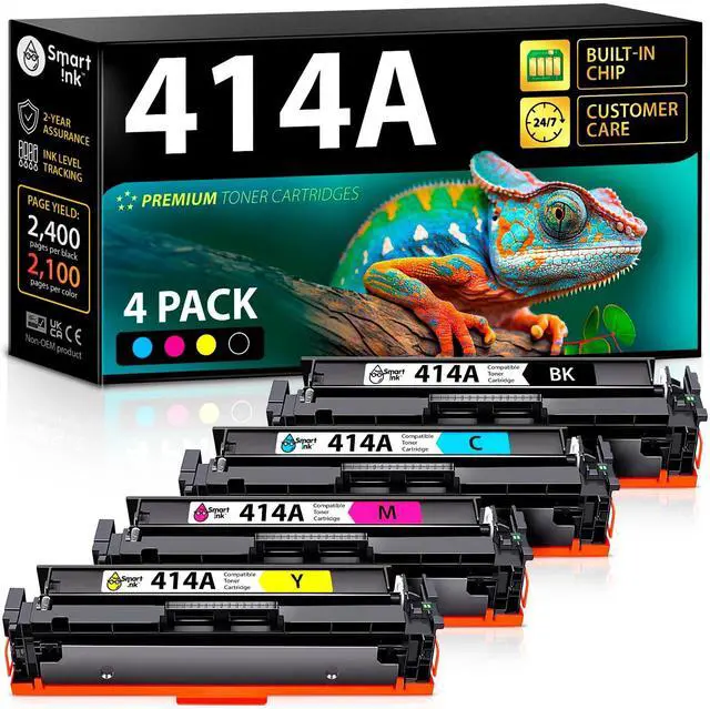 Package Contents: 1 x Black 414A, 1 x Cyan 414A, 1 x Magenta 414A, 1 x Yellow 414A (4 cartridges in total), 1 x User Guideline, 1 x Warranty Certificate. Full 414A toner cartridges 4 pack - W2020A W2021A W2022A W2023A ^^ Plug and print with Smart Ink replacement for HP 414A toner cartridge featuring built-in smart chip no extra steps or chip handling required ^^ Toner