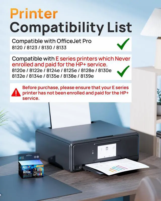 Printers: For OfficeJet Pro 8120e 8122e 8124e 8125e 8128e 8130e 8132e 8134e 8135e 8138e 8139e(*Not compatible with printers that have HP+ service activated. ) ^^ For HP923E HP923XL HP 923 ink cartridges For