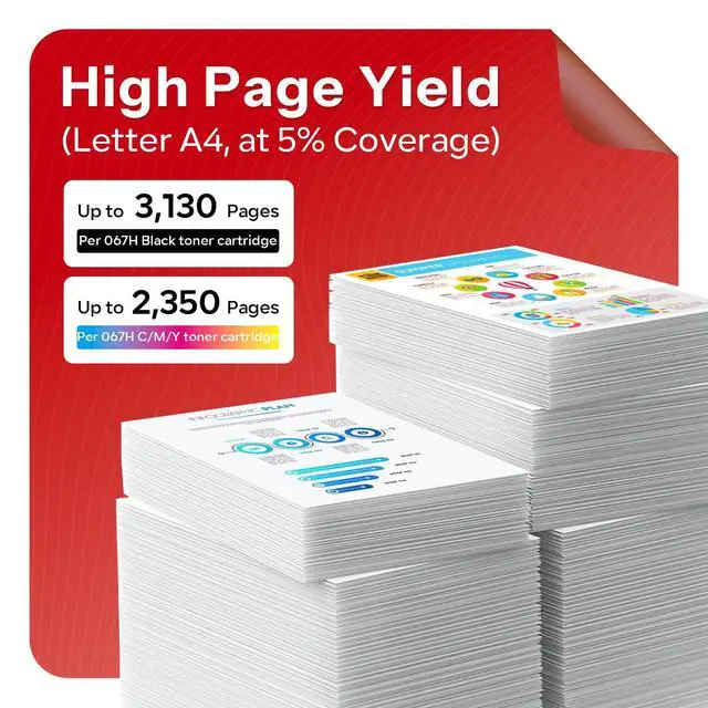Compatible Printer Models: Compatible for Canon Color imageCLASS MF654Cdw LBP633Cdw LBP632Cdw MF656Cdw MF653Cdw printer ^^ The page yield of each 067h c/m/y toner is up to 2, 350 pages, each 067h 067 black toner up to 3, 130 pages. (Based on up to 15% coverage) ^^