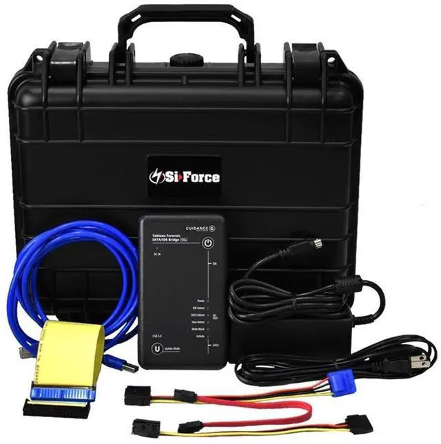 Tableau TK35U+ Kit includes: T35u Tableau Forensic SATA/IDE Bridge, TP7 Power Supply + Line Cord, TC2-8-R2 Tableau Molex to 3M Drive Power Cable, TC3-8 Tableau SATA Signal Cable, TC5-8-R2 Tableau SATA to 3M Drive Power Cable, TC6-8 Tableau IDE Cable, TC-USB3 Tableau USB 3.0 A to B Cable, T35u Quick Reference Guide, SiForce Rugged Case. ^^ SiForce Rugged Case provides all-around protection for devices and cables from water, dust, and external damage. ^^ Suitable for both the field and lab. USB 3.0 host computer connection. Read/write mode capability via internal DIP switch. ^^ Integrated, backlit LCD presents useful bridge and SATA/IDE device information. ^^ Seven LEDs provide status on power, IDE media detection, SATA media detection, host connection, write-block status, and activity.
