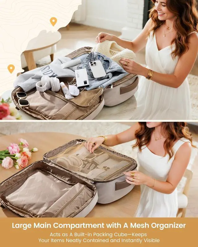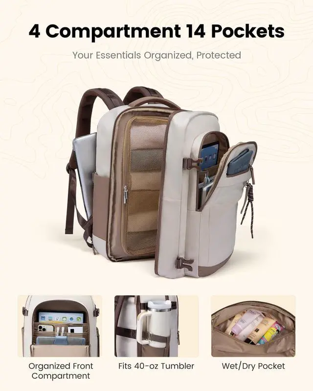 Airline-Approved & Effortless BoardingThis carry-on backpack measures 18 14 8 inches, fitting perfectly under airplane seats or in overhead bins. Its approved by major budget airlines including Spirit, Frontier, and JetBlue. The 180 opening design allows for quick security screening, making it your ideal personal item for hassle-free travel. ^^ 40L Spacious & Organized StorageThis travel backpack features a 40L large capacity, 4 compartments, and 14 pockets to keep your travel essentials neatly organized, easily holding 37 days of belongings. The main compartment has a large mesh divider thats faster and more convenient than buckle straps, while protecting irregular items from shifting or falling out.