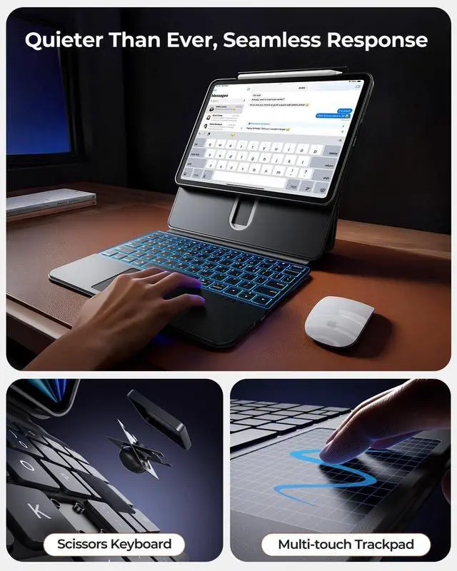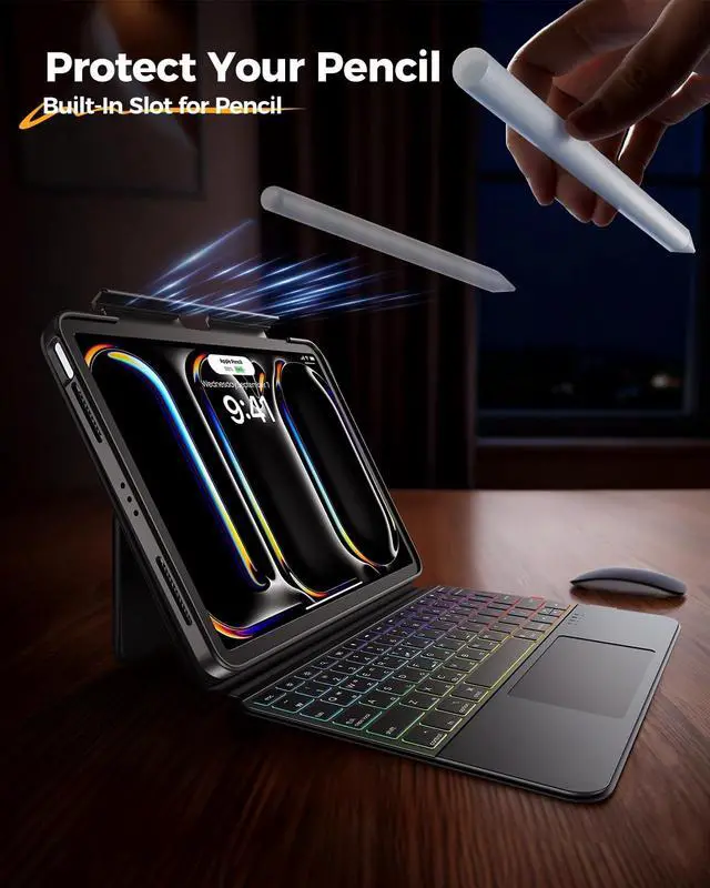 Rotation: Tailored Comfort. The built-in adjustable stand and 360 hinge let you find the perfect viewing angle. It offers raised screen view for better posture and portrait mode for FaceTime, adapting to your needs with ease. Whether sketching, typing, or presenting, it ensures the optimal viewing and working posture. ^^ Multi-Touch Trackpad, Gesture Support & 7-Color Backlit Pro Design All Scenarios Ready: Navigate like a pro via a high-precision trackpad with native iPadOS gestures. Swipe, scroll, and switch apps intuitively to boost workflow. The classic black keyboard, blending business style and customization, has 7 adjustable backlight colors for dim settings or workspace flair.