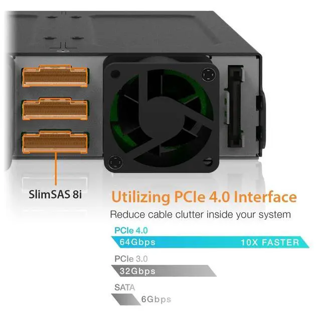 Supports 6x U. 2/U. 3 PCIe NVMe SSD, with a max drive height of 9.5 mm ^^ Designed to fit into any standard external 5.25" optical drive bay ^^ Utilizes 3x slimSAS 8i (SFF-8654) to support 6x U. 2/U. 3 SSDs ^^ Supports PCIe 4.0 specification with transfer rates up to 64Gb/s per drive bay ^^ Supports Tri-mode controllers PCIe/NVMe pinout (Broadcom, Areca, and more)