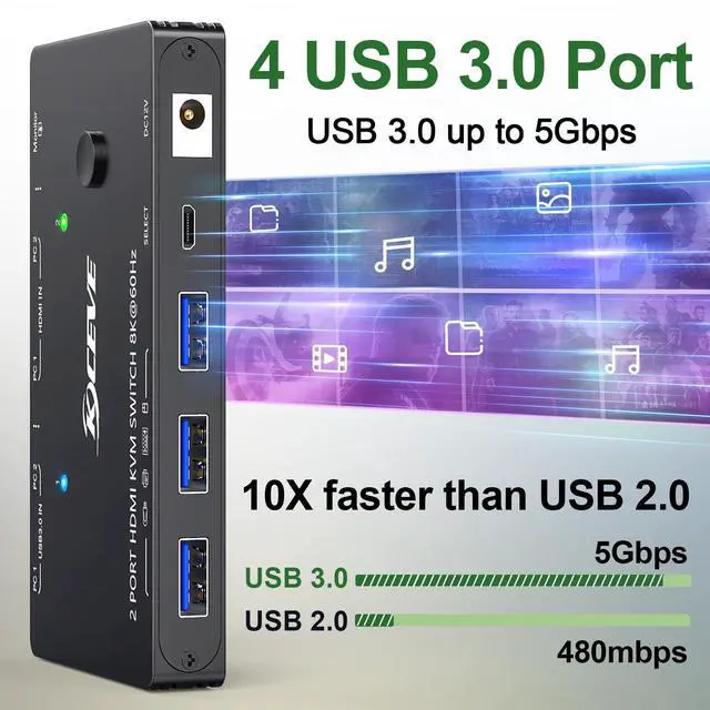 Warming: Please use HDMI 2.1, if the set distance allows, the length of cabels more short more better. ^^ HDMI KVM Switches with 3 USB 3.0 Ports2 ports KVM switch with 3 USB 3.0 ports which can recognize keyboard, mouse, printer, scaner and other USB devices. USB 3.0 offers data transfer speeds of up to 5Gbps, while USB 2.0 offers data transfer speeds of only 480Mbps.