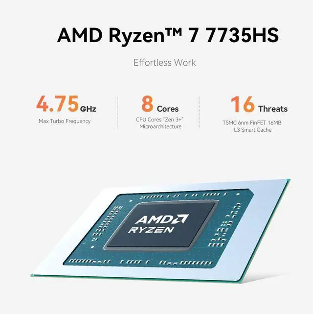 Parameter InformationCPUAMD Ryzen 7 7735HS up to 4.75GH z 8C/16T L3 16MBGraphicsAMD Radeon 680M 12core 2200MHzMemoryLPDDR5 24GBRTCReal-time Clock, Time BootAuto Power On Support auto power on after electrifiedWake On LANSupportedTPMSupport TPM 2.0 /AMD PSP 11.0WIFII ntel AX200, IEEE 802.11 axBluetoothIntel AX200, Support Bluetooth 5.2I nstallation TipsTo avoid initial setup problems, the first time you use the Beelink Mini PC, follow the steps below to set it up. 1) Please do not connect the network or wifi until your mini computer's operating system is working. Please remember not to fill in the email, skip this step, you can use the machine normally.