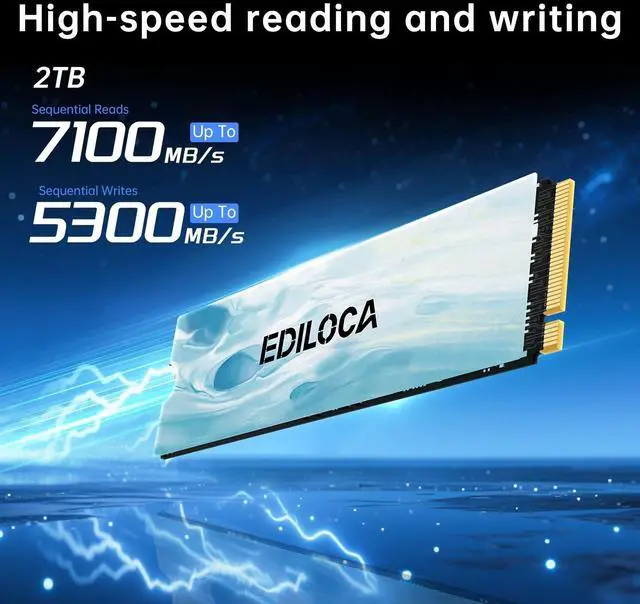 Top Performance]: Ediloca EN880E M. 2 SSD 2TB adopts NVMe protocol and PCIe Gen 4x4 specifications, and the maximum read and write speed can easily reach 7100MB/s and 5300MB/s. With lightning-fast speeds, the EN880E NVMe SSD can make your computer's systems and applications respond quickly, improving work efficiency.