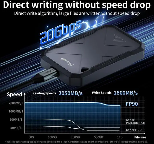 [Super FAST SPEEDS]FP90 External SSD using the latest NVMe protocol data transmission technology, the ultra-high speed of 2050MB/s allows your data to be transmitted instantly, making it easier for you to process large amounts of data. Whether shooting high-definition videos or editing large files, it can easily handle it, making your creative process smoother. ^^ [WATERPROOF DROP-PROOF AND DUST-PROOF]The external solid state drives With IP68 triple protection design, it can provide all-round protection for your data, whether it is underwater, on the ground or in the dust. You don't have to worry about the risk of data loss when shooting outdoors, traveling and exploring.