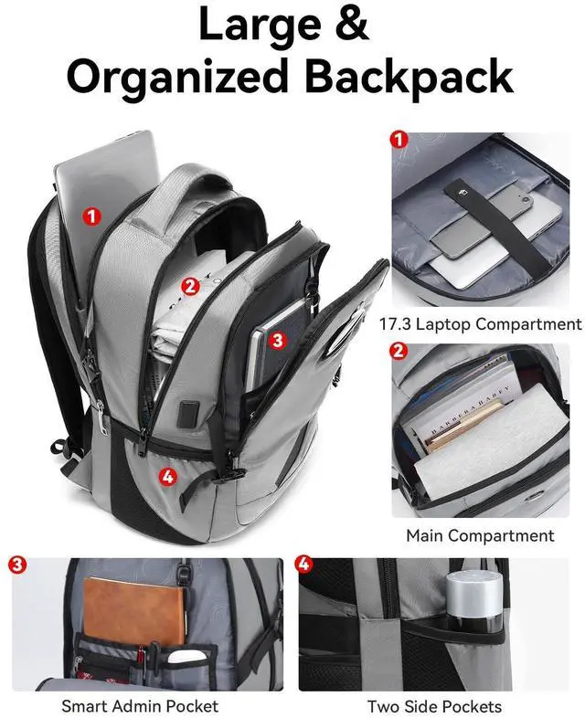Compartments and Pockets: Men travel laptop backpack with more than 10 independent pockets for large storage and organization for small items. 4 spacious main multi compartments with many hidden pockets can accommodate lots of stuffs like travel accessories, clothes, notebook, pen pockets and key fob hook, 2 sides pockets holds a 32oz water bottle and umbrella pretty well make your items organized and easier to find. Ideal laptop backpack for men and women. ^^