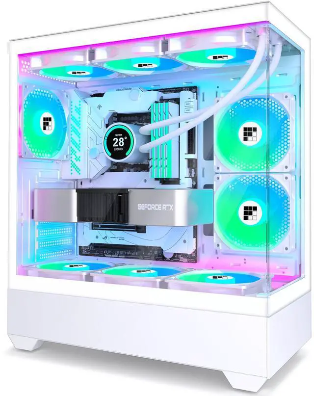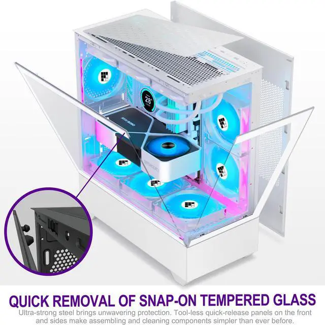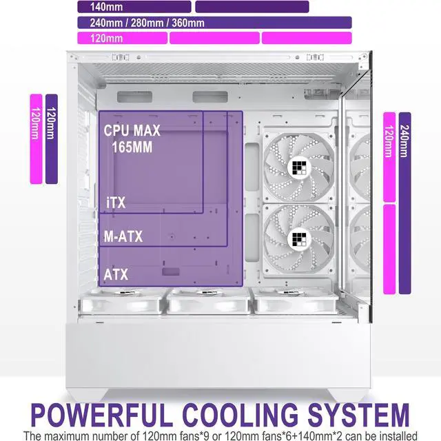 Dual-chamber design separates hardware from power supply and drivers, enhancing thermal performance and cable management. ^^ Fully transparent high-hardness tempered glass showcases every detail of the hardware. ^^ Pre-installed with 6x 120mm ARGB PWM fans (5x reverse, 1x forward). ^^ Super Cooling System, supports 360mm radiators on top. Air cooling supports up to 170cm in height. ^^ ATX/M-ATX/ITX motherboards, supports GPUs up to 400mm ( 15.75 in), accommodates PSUs up to 200mm ( 7.87 in), supports 1x HDD and 3x SSDs.