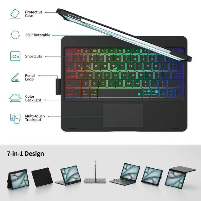 • VERSATILE DESIGN: 7-in-1 keyboard case with 360 rotation capability allows multiple viewing angles and usage modes for typing, viewing, reading, and drawing