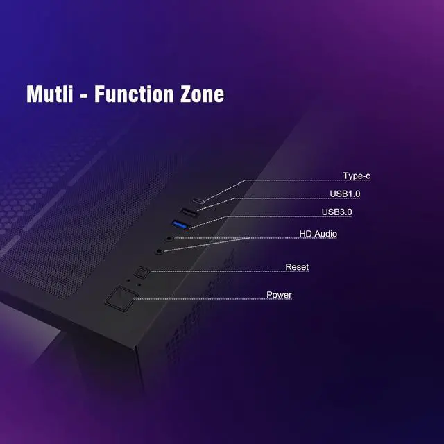It supports GPUs up to 420mm in length, two 3.5 -inch hard drives, and one 2.5 -inch hard drive. ^^ Type-C and USB 3.0T he case is equipped with high-speed USB 3.0 and Type-C ports on the exterior, allowing it to connect with a wider range of devices. ^^ Built-in GPU support bracketConsidering the increasing weight of modern GPUs, the case features a built-in GPU support bracket to prevent heavy graphics cards from putting strain on the motherboard. The integrated support bracket also enhances the aesthetic appeal.