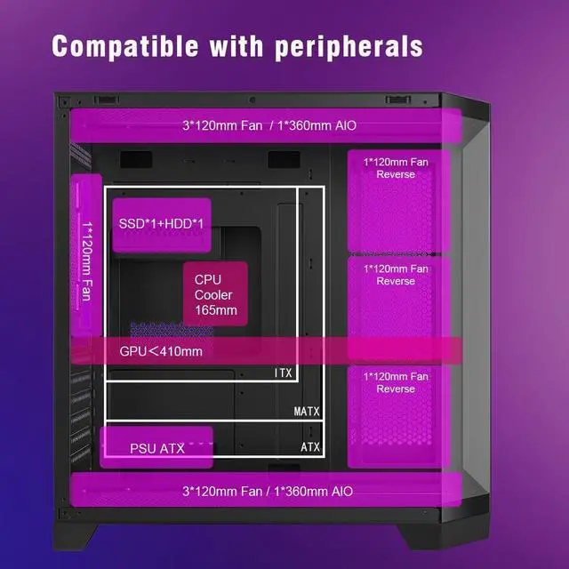 Pre-Installed Fan4 high-performance 120mm ARGB prism gaming fans have already been installed. ^^ Panoramic Tempered GlassThe front and side of the case feature three tempered glass panels, adding depth and a more dimensional look to the case. ^^ Ventilation and Dust ProtectionThe case can support up to 10 fans or 7 fans with a 360mm AIO liquid cooler. The top and bottom feature large magnetic dust filters to prevent dust from entering, ensuring the case remains clean and performs optimally. ^^ Spacious and High-CapacityThe case has a large capacity, making it ideal for use in spacious setups and offering users more accessory options.