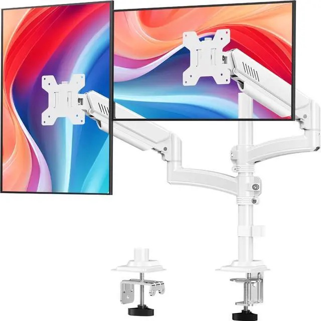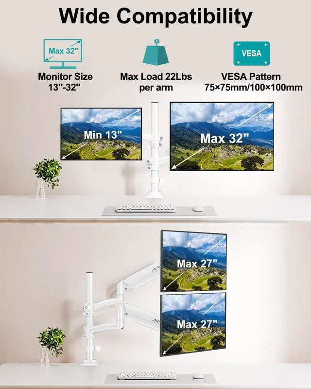 Dual pneumatic springs enable seamless height adjustments by dynamically counterbalancing monitor weight. You can customize your screen angle and height effortlessly to Increase comfort and enhance productivity. ^^ Universal Compatibility -To ensure our dual monitor mount works perfectly with your setup, each monitor should meet three requirements at the same time: a screen size of 1332 inches(not limited to 32 30 28 27 25 24 23 22 21 20 19 17 inch screen, but not compatible with 1000R/1500R/1800R curved screens), a weight range of 4.422 lbsper arm, and the back of the screen have VESA mounting holes of either 75x75mm or 100x100mm. We suggest double-checking these details before buying. ^^ Space Optimization - Mounting your monitors on this double monitor mount frees up over 80% of desk space, leaving ample room for keyboards, mice, and laptop setups. Built-in cable management keeps wires neatly hidden, transforming cluttered work areas into clean, organized stations. ^^ Robust Monitor Arm - The monitor arm in this tall monitor stand is tested to withstand 20, 000 motion cycles for lasting durability, offering sturdy stability during movement or adjustments. It comes with clearly labeled parts and instructions, you can choose clamp mounting (for desks 0.392. 76" thick) or grommet mounting (for desks 0.391. 97" thick).