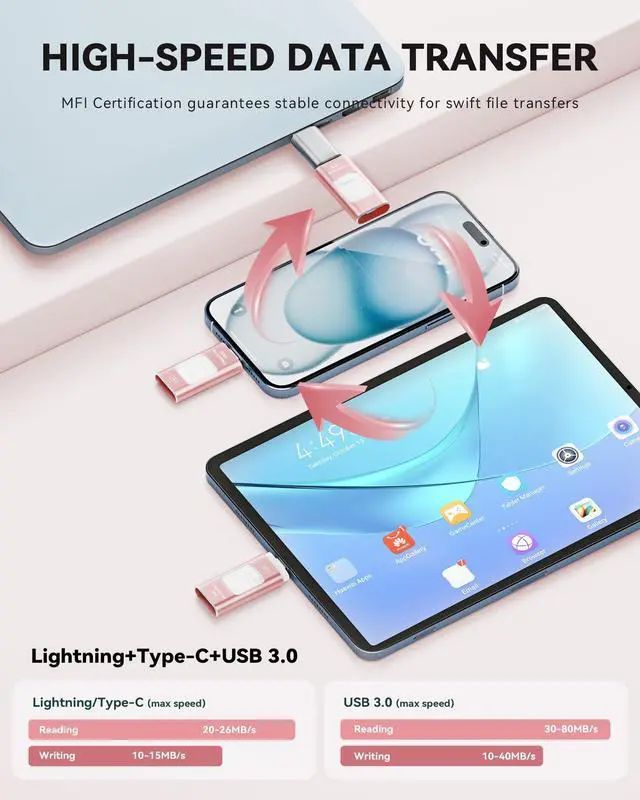(Note: To use this iphone memory stick on an iPhone/iPad, please download and install the "ROSPE" app from the App Store. For Android phones, simply enable the OTG function, no need to download any additional apps. ) ^^ Lightning-Fast Transfers, Enjoy