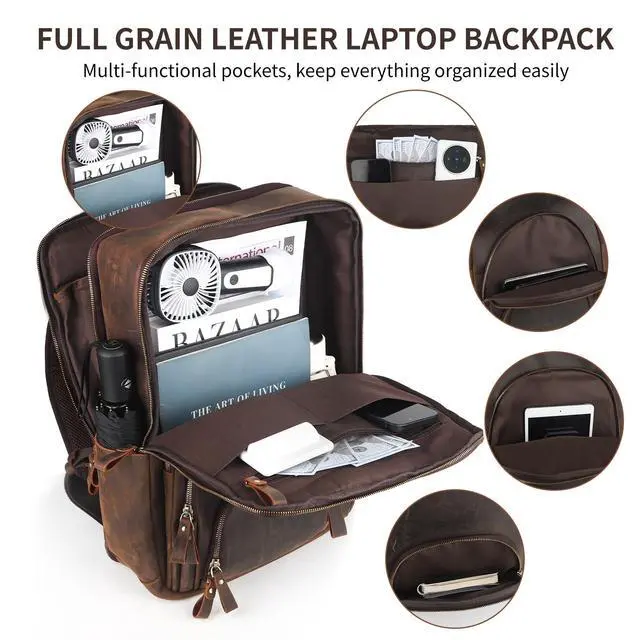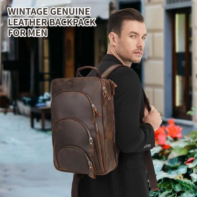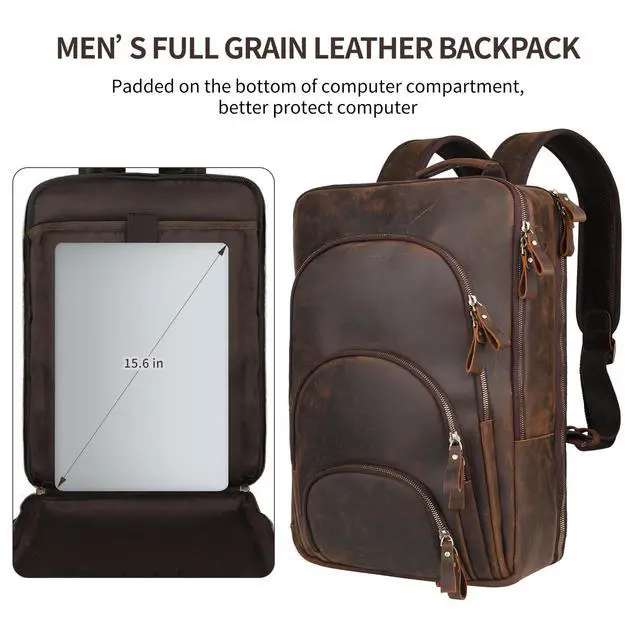 ^^ Full Grain Leather Backpack Ensure a secure & long-lasting usage everyday & weekend mens backpacks. Serve you well as professional office work bag. Full Grain Leather Backpack 15.6" Laptop Bag Men's Vintage Genuine Leather Business Backpack Travel Hiking Camping Rucksack Overnight Weekender Daypack