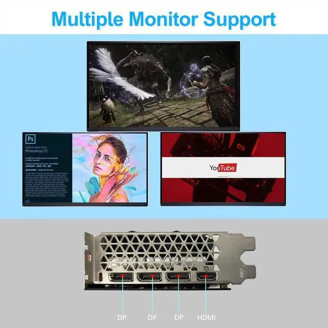 AMD Software: Adrenalin Edition. Access features like Radeon Image Sharpening, FidelityFX, and driver-level performance tuning to enhance visual quality and customize your gaming experience effortlessly. ^^ Equipped with 3x DisplayPort and 1x HDMI ports, supporting up to 3 displays simultaneously. Ideal for multi-monitor gaming setups, streaming, or productivity workflows, giving you flexibility in how you connect your monitors and peripherals.