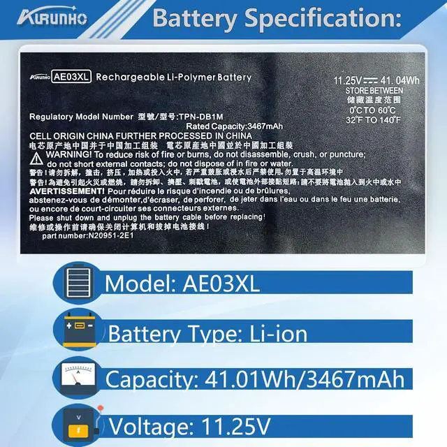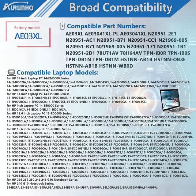 Color: Black. 100% brand New from Manufacturer. ^^ Fits Models for HP 14 inch Laptop PC 14-EM0000 14-EP0000 14-EE0000 Series, 15.6 inch Laptop PC 15-FD0000 15-FC0000 Series, 256 255 250 246 245 G10 240 G10Notebook Series. ^^ Compatible P/NAE03XL, AE03041XL-PL, AE03041XL, N20951-2E1, N20951-AC1, N20951-B71, N20951-CC1, N21969-005, N20951-B71, N21969-005, N20951-171, N20951-1B1, N20951-2D1, 78U71AV, 78H64AV, TPN-IB0R, TPN-IB0S, TPN-DB1N, TPN-DB1M, HSTNN-AB1B, HSTNN-OB3E, HSTNN-AB1B, HSTNN-WB0D. ^^ SecurityALL of our battery is CE, FCC, RoHS Certified. And have passed a series tests of short circuit, overheating, and overload protection before shipments for safety. ^^ AURUNHO After-sales We guarantee 30 days money-back and 12-month warranty; 24 x 7 email support. For any battery questions you fell free to contact us via "Your Orders" tab in your account, we will be glad to help you within 24 hours.