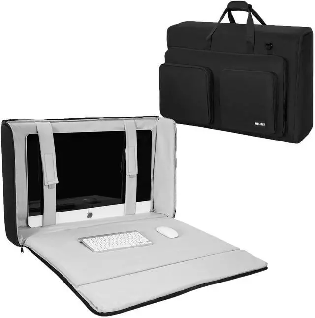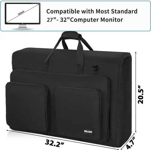 SIZE: 32.2 * 4.7 * 20.5 inches ^^ 360 Degree ProtectionThick foam padding surrounds the entire monitor carrying case including the cover so all your valuable equipment is protected! Multiple items can be safely transported ^^ Adjustable padded beltWELIDAY screen carrying case can accommodate screens up to 27 inches. 2 adjustable padded belts can stabilize the screen and reduce shaking. 900D high-density waterproof Oxford cloth material, sturdy and durable, protect your device from moisture damage ^^ Large CapacityThe 27 inch monitor case has 3 large zippered front pockets can hold keyboard, mouse, headset, remote control, trackpad, cables and other accessories. Put all your monitor accessories into the monitor bag! Equipped with wear-resistant pads on the bottom to increase the durability of the TV Transport bag ^^ Multiple Carrying OptionsAdjustable shoulder strap and comfort handles make it easy for one person to carry. Trolley straps allow you to clip the bag to your suitcase and leave your hands free. All straps are reinforced! Perfect for transporting LCD screens, monitors and TVs