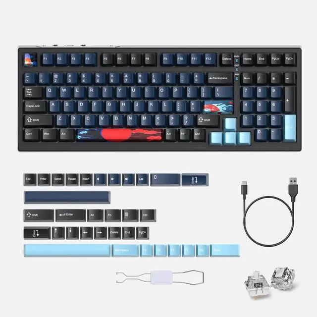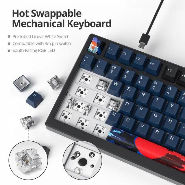 96% RGB Mechanical Keyboard96% layout with 99 keys, retains separate arrow keys, making the desktop cleaner without sacrificing essential functionality. It can perform the commands of a full-size keyboard with more space for mouse movement. This gaming keyboard is a boutique equipment for PC gamers and office users. ^^ Hotswappable Custom SwitchesHigh-quality PCB supports 3/5-pin hot-swappable, so you can enjoy the fun of making your own unique pc gaming keyboard without soldering. The linear fast white switch Of improves the accuracy and initial pressure of the switch, provide a comfortable keystroke feeling, an amazing out-of-the-box clean typing sound.