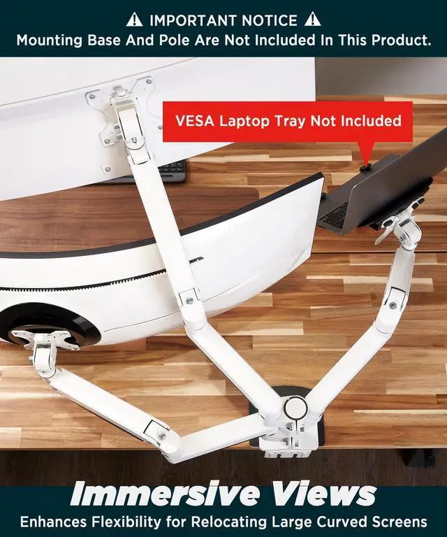 ^^ Modular Extension Arms - The base with extra tall pole has 88 pounds mounting capability, which can be upgraded to a dual monitor mount or triple monitor mount. Dual stacked monitor mount fits up to two 49" ultrawide monitors. Triple monitor stand fits two stacked monitors and a sideways monitor. ^^ Screw Set for VESA Mounts - M4 and M5 screws come standard in the package. For Samsung G9 monitors, use the VESA adapter that comes with your monitor. ^^ IMPORTANT NOTICE - MOUNTING BASE AND POLE ARE NOT INCLUDED IN THIS PRODUCT.