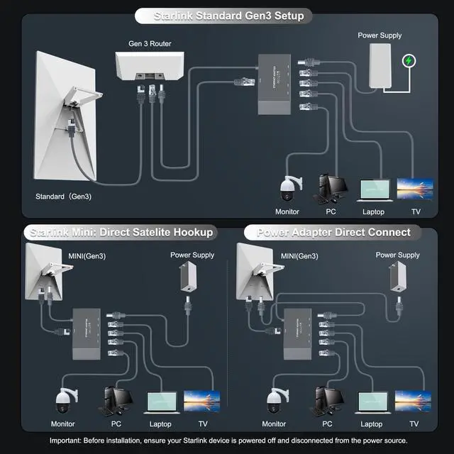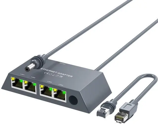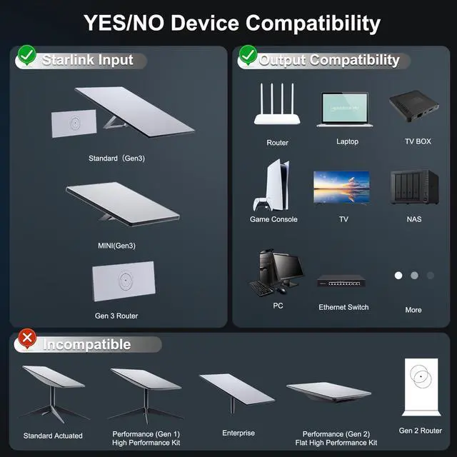 Designed for Starlink Gen 3 & Mini Zero-config integration adds 4 wired ports without altering existing setups. Delivers stable connections up to 100m with ultra-low latencyspecifically overcoming WiFi weaknesses in latency-sensitive scenarios (gaming/4K streaming) and for distant devices (garages/basements). ^^ Universal Compatibility Connect virtually any RJ45-equipped devicerouters, laptops, desktops, smart TVs, printers, and moreto your Starlink Ethernet Adapter. All ports support standard RJ45 cables (*For optimal performance, use Cat5e/6/7/8 cables*). Fully compatible with both Gen 3 and Mini systems. ^^ Enhanced Wired Coverage Connect up to 4 devices via Ethernet, with each port delivering stable 1000Mbps speeds 24/7.