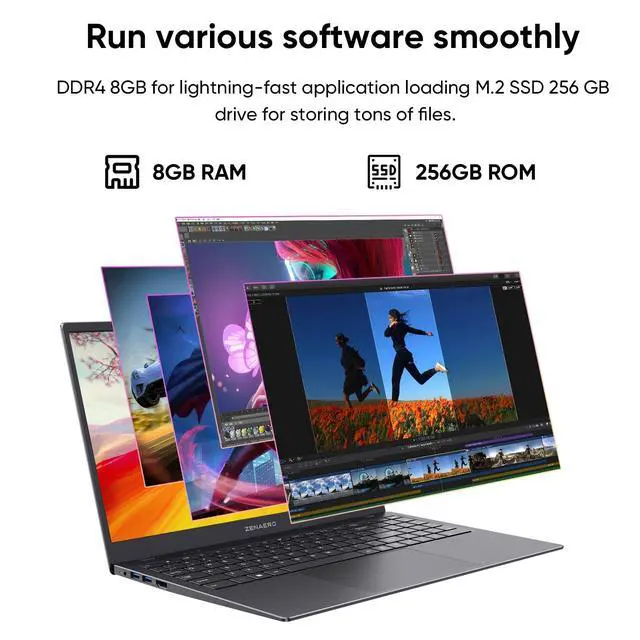 Stable Computing Performance - ExceBook is a powerful and stylish laptop that provides a seamless computing experience. With its Celeron N4000 processor, UHD Graphics 600, and 15.6 -inch IPS display with 1920 x 1080 resolution and 300 nits of brightness, this laptop is built for speed, efficiency, and stunning visuals. ^^ Lightning-fast Storage and Connectivity- The laptop is equipped with 8GB of LPDDR4 RAM, and a 256GB M. 2 SSD with SATA3 interface, providing ample storage and speedy performance. Its 2.4G /5G WiFi module with support for 802.11 a/b/g/n wireless protocols, as well as Bluetooth 5.1, ensure seamless connectivity and versatility.