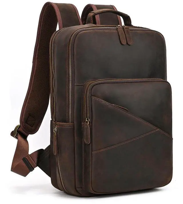 Outer structure: 2 zipper pocket, 1 side pocket for bottle or umbrella. This casual leather backpack is big enough to carry on 16 inch laptop and many essentials like ipad, A4 files, notesbooks, umbrella, wallet, water bottle etc.