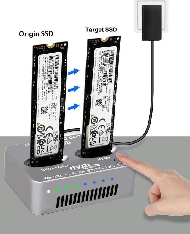 Steps: 1. Connect the AC/PD Power Adapter after source SSD (into left P1 bay) and Target SSD ( into right P2 bay) Inserted, 2. Press power on button, P1 P2 indicators shows that dual SSD are recognized. 3. Press "Start" Button for about 5 seconds till all of the "Percent Progress Indicators" flash simultaneously, release the Botton. 4. Then re-click the Botton at once again, the percent process indicators flash sequentially, Clone will start 5. after all four progress indicators on, Clone is completed ^^ [Cooling Design for