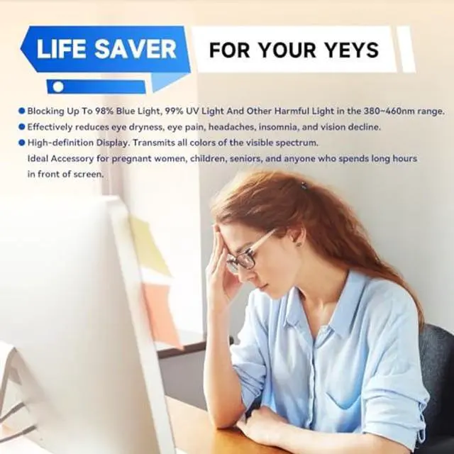 Note: Don't include the bezel in your measurement. [Supporting Curved Monitor] ^^ Anti Blue Light and Harmful LightOur computer screen blue light blocker filters out up to 98% of blue light and up to 99% of UV rays in the 380~460nm range, and filter all harmful light emitted by the screen helping to reduce eye fatigue and related discomfort. It also has an anti-glare function that prevents digital eyestrain and headaches. Whether it is children elderly or pregnant women, students, suitable for most other people. ^^ Reduce Glare and Scratch PreventionThe computer anti blue light glare cover 27-inch monitor adopts light filtering optical materials imported from Japan, which can reduce 95% glare and reflective light. You can see a crystal-clear monitor screen even when you're working next to sunlight or bright light. The highly transparent and highly powerful protective layer not only presents high-definition picture quality, but also resists scratches from cat claws and sharp objects, and keeps dust at bay. ^^ EASY TO INSTALL