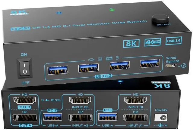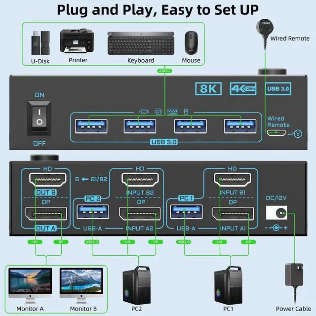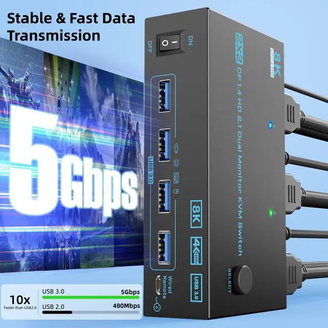 KVM Switch]: 2 port 2 monitors 2 computers KVM switch equipped with 4 USB 3.0 ports for connecting peripherals such as keyboard, mouse, scanner, printer, USB camera, and hard drive ect. 5Gbps transfer rate is faster and more stable than USB 2.0. Please connect the USB cable from each PC to power the 8K KVM and transfer the USB data ^^ [Wide Compatibility & 2