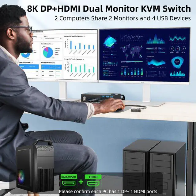 Monitor KVM Switch]: 8K KVM switch 2 monitors 2 computers is innovative 2-in-2-out DisplayPort HDMI KVM switch that allows seamless sharing of two monitors and one keyboard/mouse setup between two computers or laptops, effectively reducing clutter and maximizing productivity. It is a perfect tool for multitaskers like businessmen, designers, game player or other people who need efficient workspace management ^^ [8K@60Hz/4K@144Hz Dual DP
