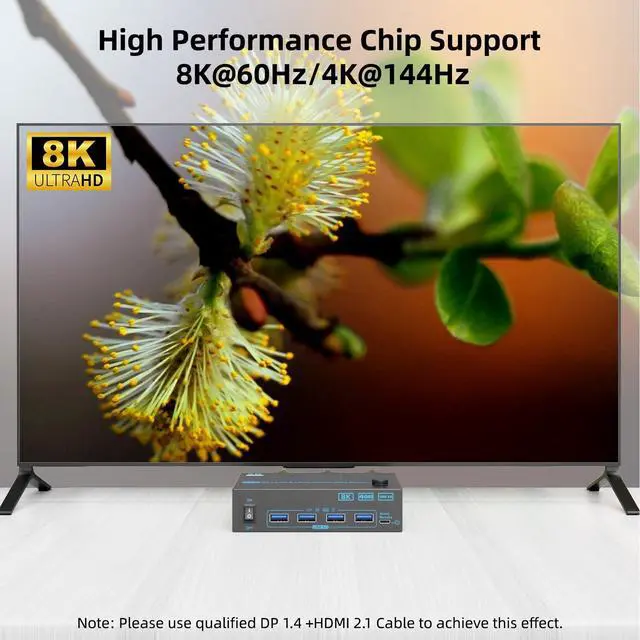 HDMI KVM Switch]: With our 2 in 2 out dual monitor kvm switch, you can experience stunning visuals with support for resolutions up to 8K@60Hz and 4K@144Hz. Whether you're gaming or working on high-resolution graphics, the DP 1.4 HDMI 2.1 KVM switch ensures you enjoy a crystal-clear image with no pixelation or delay, bridging the gap between high-definition content and fast-paced gaming needs ^^ [5Gbps USB 3.0 DP 1.4 HDMI 2.1
