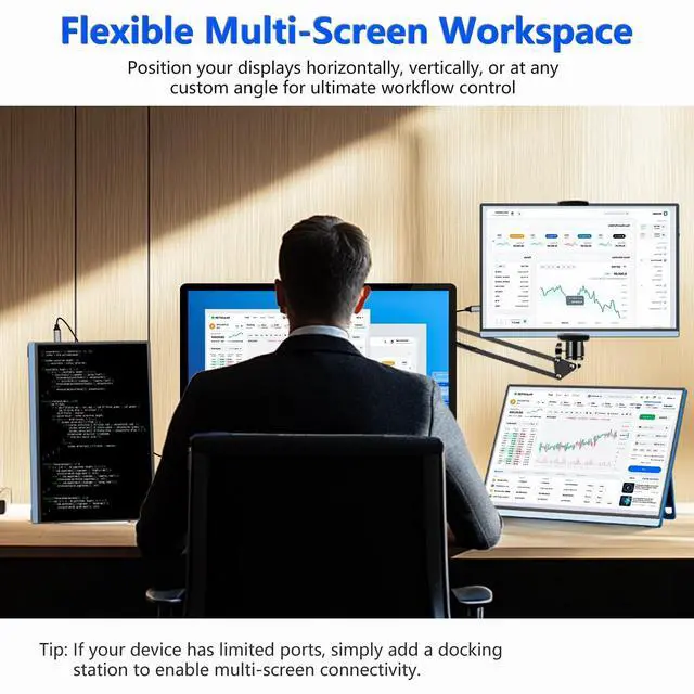 Portable Monitor: this external monitor adopts a 16 inch 1200p FHD IPS screen featuring IPS screen with 178 wide viewing angle, 100% sRGB, and 1200:1 contrast ratio ensures color accuracy; FreeSync technology eliminates screen tearing for smooth motion. HDR enhances dynamic range by 300% with deeper blacks/whites; low-blue-light + flicker-free layers reduce eye strain. ^^ Enhance Work Efficiency, Use it as your second computer screen to run multiple applications simultaneously without the need to switch back and forth. Business presentations, course learning, graphic design, shopping comparison, music production, etc. The built-in stand adjusts the viewing angle from 0 to 75 degrees for stable support and can quickly switch between landscape and portrait modes based on your presentation content.