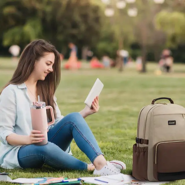LOVEVOOK Laptop Backpack for Women with Pouch Pocket for Large Capacity Cup,17 Inch Teacher Nurse College Work Backpack Purse,Waterproof Laptop Bag Computer Back Pack for Travel, Khaki-Coffee-Black