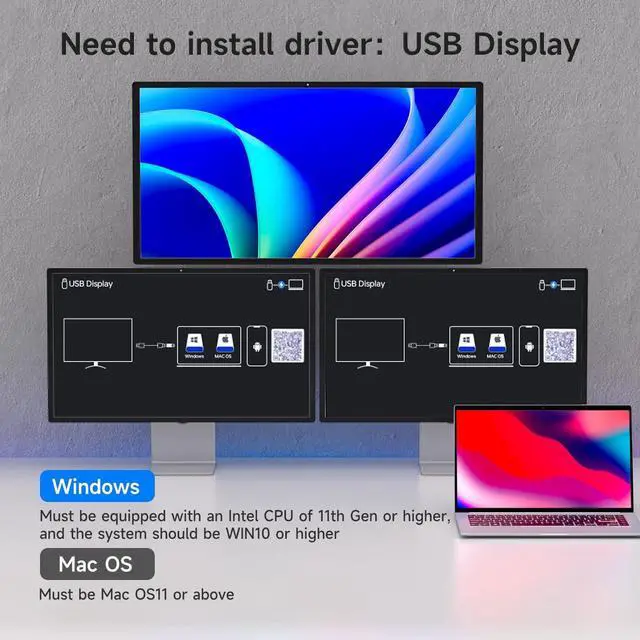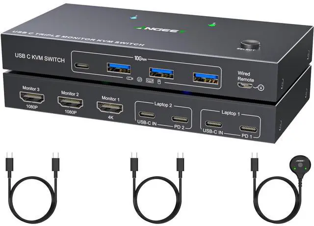 USB C Docking KVM Switch 3 Monitors 2 LaptopsThe USB C 3 monitor KVM switch combines USB-C docking station and 3 monitors KVM switch, which not only does it expand your laptop into a workstation with 3 HDMI monitors, 4x USB 3.2 ports (3USB-A + 1USB-C), and 2*80W PD charging ports, but also allows to one-click switching between 2 laptops. ^^ The 2 computers 3 monitors KVM switch supports simultaneous output of 3 HDMI monitors, with resolutions of 1*4K@60Hz+2*1080P@60Hz.: After connecting your laptops to the USB C KVM switch, the laptop will automatically recognise the USB device and a pop-up window will appear, please follow the wizard to install the USB driver. This driver does not record any information, Only used for identifying monitors. ^^ 3 Monitors KVM Switch with 4 USB 3.2 PortsThe triple monitor KVM switch USB C docking station is euqipped with 4 USB 3.2 ports(3USB-A + 1USB-C) for connecting keyboard, mouse, external hard drives, etc. With a data transfer rate of up to 10Gbps, Backward compatibility with USB 1.1 / 2.0 / 3.0. ^^ Charge your laptops via KVM SwitchKVM switch 3 monitors 2 computers USB C features with 2x80W PD charging ports, simply plug your laptop charger into the PD port to charge your laptop, eliminating the hassle of limited laptop ports.: It is necessary to plug the laptops charger into the PD port to power the KVM switch for stable operation. ^^ Wide Compatibility & Two Switching Ways The 2 port USB C 2 laptops 3 monitors KVM switch is effortlessly compatible with Windows and Mac OS. Supports two switching methodsphysical button and wired remote( 1.5 m), while LED indicators clearly display the active computer. ^^ ()Driver installation is required to recognize the monitors; (2) To get the 2 computers 3 monitors USB-C KVM switch work properly, the laptop system must be 11th or above; 3It is necessary to plug the laptops charger into the PD port to power the KVM switch; (42 USB C cables in the packaging, but HDMI cables are not included. (5) Not supporting EDID emulation and hotkey switching. Any problem, just take a little time to email us, you will receive a 100% satisfactory solution.