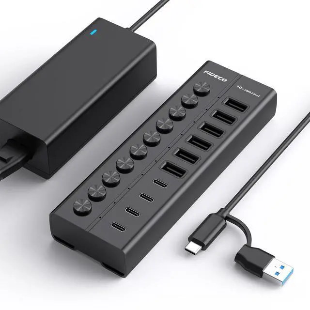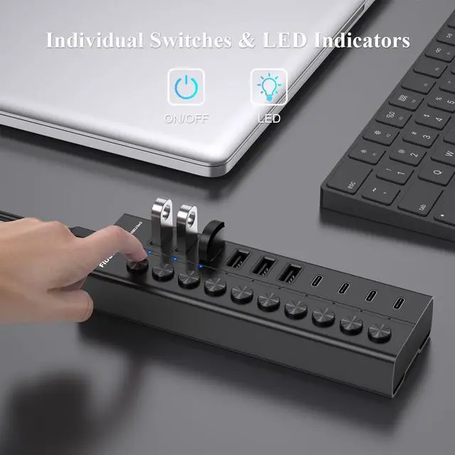 The USB splitter can support data transfer and device charging simultaneously, therefore, the powered USB hub can absolutely save your time, help eliminate dangling cords or unsightly plugs, and help you get rid of the messy desk. ^^ Independent On/Off SwitchThe specially designed switches can help control your device more easily without frequent plugging and unplugging in daily use. Our USB port hub can support hot-swapping for seamless peripheral management, greatly boosting your efficiency. ^^ Aluminum DesignFIDECO powered USB hub is made of full aluminum alloy to help dissipate heat quickly.