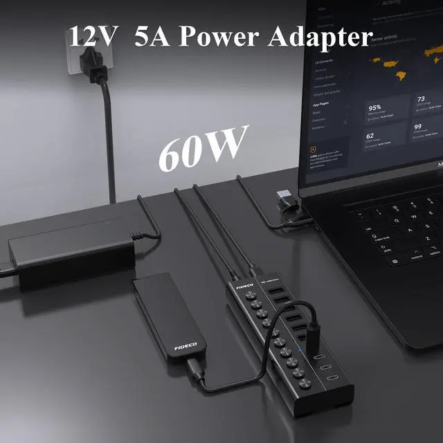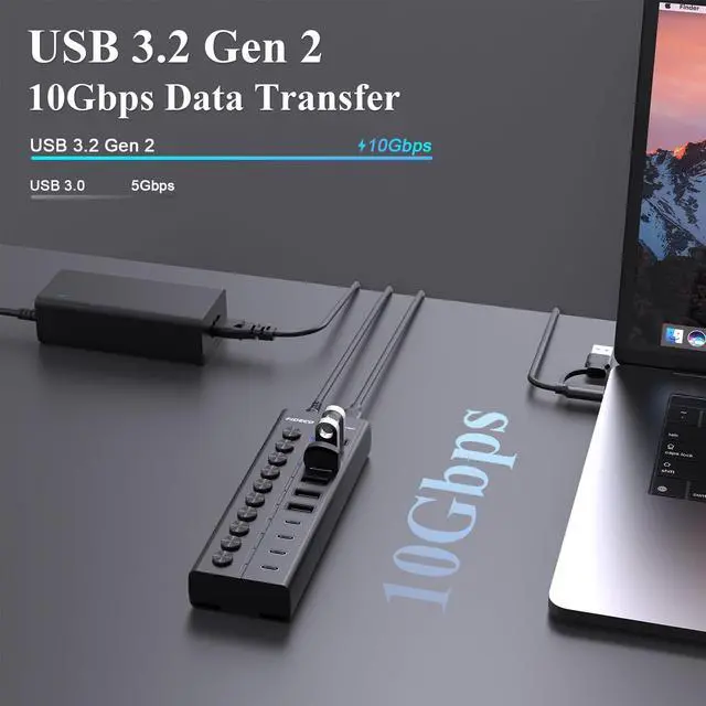 10Gbps Super SpeedFIDECO USB hub features USB 3.2 Gen 2 standard with maximum data transfer speed up to 10Gbps, and it will greatly improve your work productivity and connectivity. ^^ 60W Powered USB HubEquipped with 12V 5A power adapter for stable and reliable powering and charging for your various devices, and the built-in surge protection can effectively protect your devices from damage during electrical storms. ^^ Support BC 1.2 ChargingThe USB 3.2 Gen 2 ports can support BC 1.2 charging with a maximum power output of 5V/ 1.5A, which is sufficient to charge USB devices.