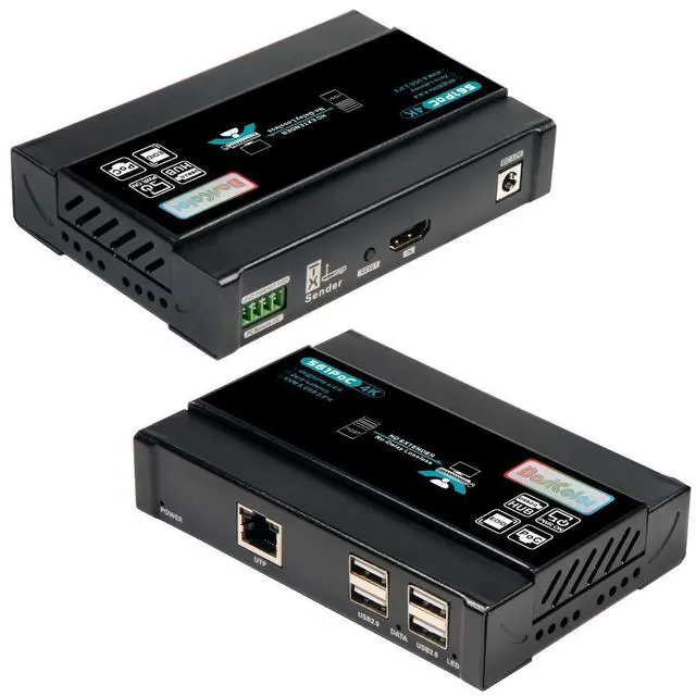 KVM Extender: 4K USB Extender with 4 usb 2.0 ports, high-speed usb 2.0 up to 480Mbps. The 4k hdmi ethernet extender support full-featured USB 2.0 extension, extend keyboard, Bluetooth, USB headsets, Camera, Mic and so on. ^^ Plug&Play PoC
