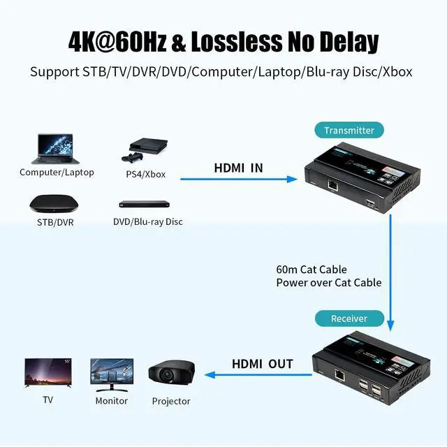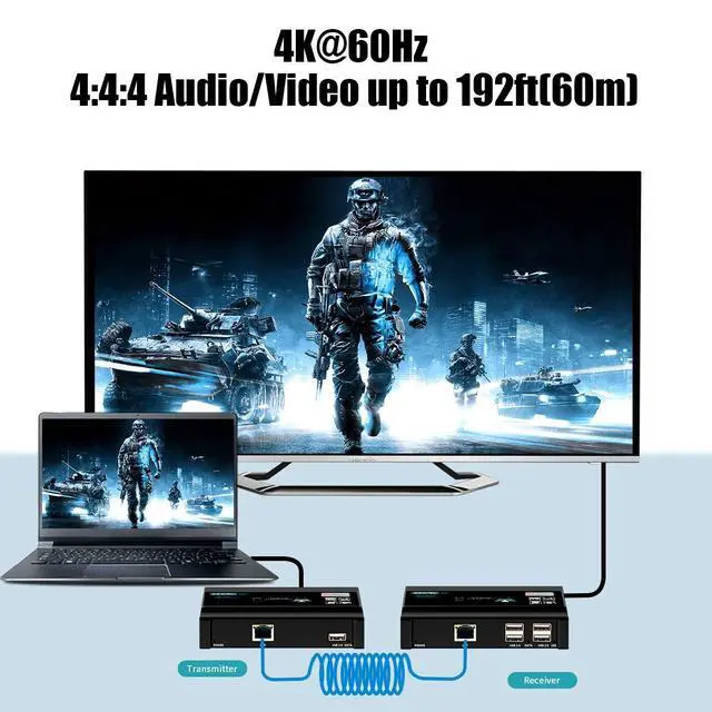 USB Extender: This KVM Extender resolution up to 4K@60Hz, support 4K@60Hz/50Hz/30Hz, 1080P@60Hz/24Hz, 720P@60Hz/50Hz, 480P/1080i/720i etc... provide you with a ultra high quality video viewing experience. ^^ 196Ft