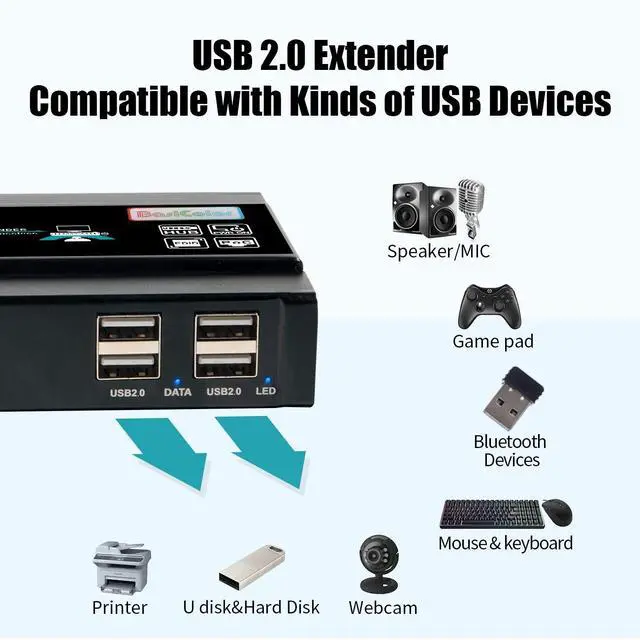 Long-Distance Lossless Transmission: The HDMI USB Extender over a single cat5 / cat6 Ethernet cable to 60M (196Ft) losslessly, kvm extender 4K HDMI signal zero delay transmission. Max 60m for keyboard and mouse, Max 35m for USB Flash disk, webcams, etc usb storage devices. ^^ 4 Ports USB 2.0