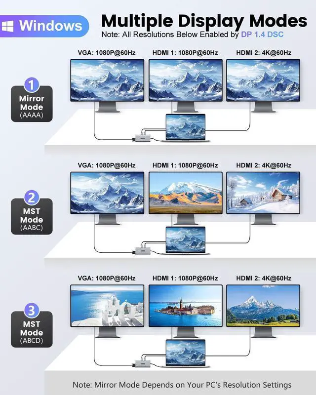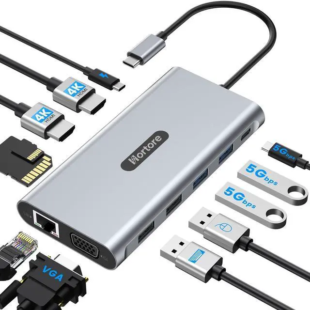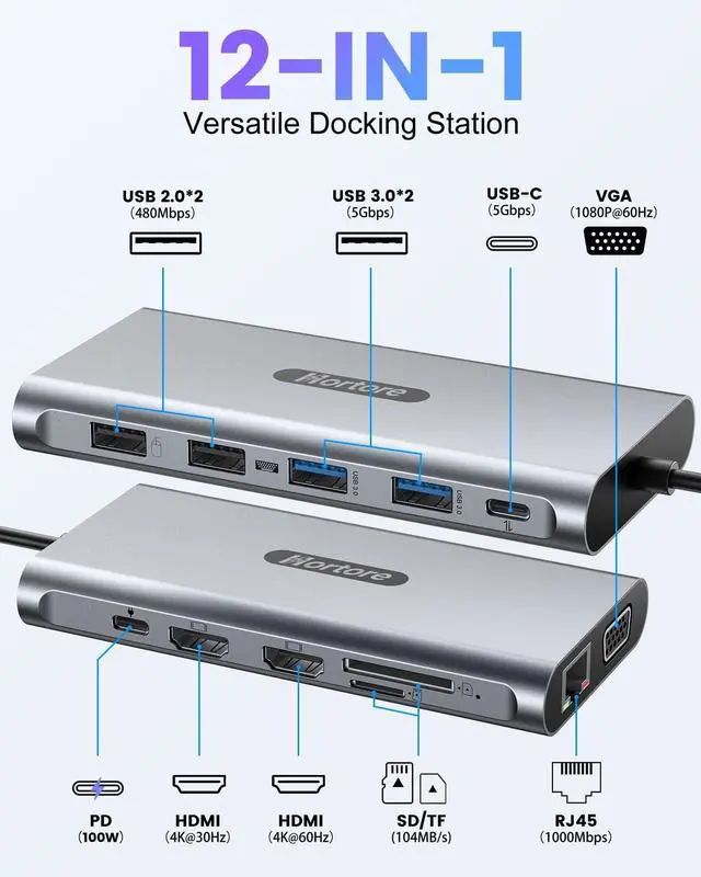 12-in-1 USB C Docking StationOne cable, seamless connectivity. This USB-C hub multiport adapter expands a single USB-C port into 2 HDMI, VGA, RJ45 Ethernet, 100W USB-C PD, USB-C data port, 2 USB 3.0, 2 USB 2.0, and an SD/TF card readeran all-in-one laptop docking station designed for daily productivity. ^^ Triple Display SupportThis docking station dual monitor supports triple external display setups on Windows systems using SST and MST modes, enabling expanded screen space via HDMI and VGA outputs, with resolutions up to 4K@60Hz when using a single display.