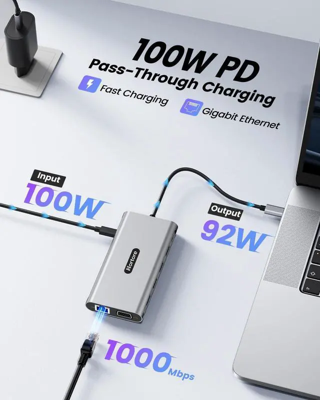 macOS supports mirror mode or extended mirror mode only. Multiple external displays will show the same content, and MST (Multi-Stream Transport) is not supported on macOS. Ideal for advanced multitasking and professional productivity environments. ^^ High-Speed Data TransferThe built-in USB hub features USB 3.0 ports (up to 5Gbps) for fast file transfers, USB 2.0 ports (480Mbps) for stable peripherals such as keyboards and mice, and an SD/TF card reader (up to 104MB/s) for quick photo and video access. ^^ 100W PD Charging & EthernetThis USB-C docking station supports up to 100W power input and delivers up to 92W output for safe laptop charging while in use.