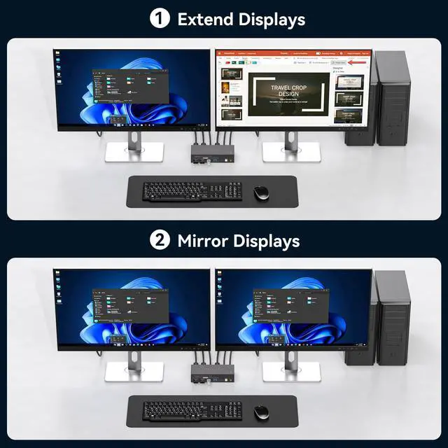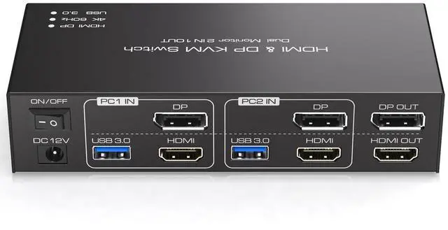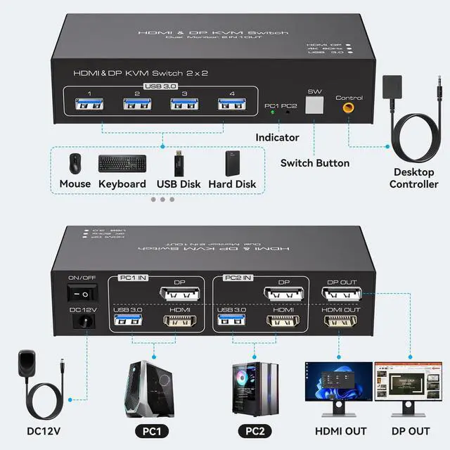 KVM Switch Dual MonitorThe kvm switch 2 monitors allows you to control two computers sharing two monitors with one set of keyboard and mouse, KVM switches support extended© mode. The kvm 2 monitors Includes DP and HDMI ports, so please make sure your computers/laptops/docking stations have DP+HDMI port, and KVM don't support the signal conversion function (HDMI input can only be output to a monitor with HDMI, DP input can only be output to a monitor with DP). The DP and HDMI ports of pc1 in on the product must be connected to the same computer, pc2 ditto ^^ Support Ultra HD 4K@60hz VisualsThe hdmi+ dp kvm switch 2 monitors support resolution up to 3840*2160@60Hz(4K@60hz) and is backward compatible with 4K@30Hz, and 1080P@60Hz, Immerse yourself in the world of crystal-clear images, Brings you realistic visual enjoyment.