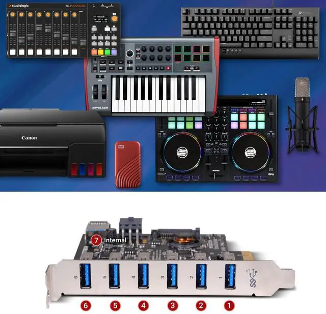 Connects Seven USB-A Devices: Adds seven USB-A 5Gbps ports (six external ports plus one internal port) to your computer, using only one PCIe card slot.