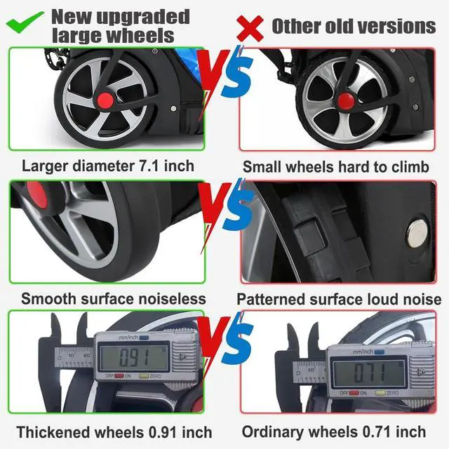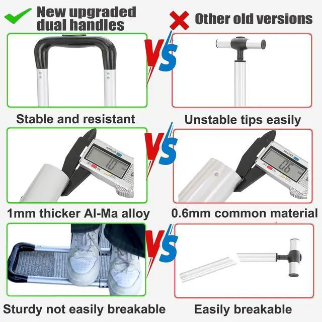 Silent Large Wheel with Concealable Wheel CoverCompared to other older backpacks, ours comes with larger PVC wheels ( 7.1 inches in diameter), making it easier to climb stairs. Greater thickness ( 0.91 inches) ensures more stable use and prevents wheel jamming. The special smooth wheel surface ensures silent operation. The concealable wheel cover protects clothes from dirt by enclosing the wheels when carried on the back ^^ Reinforced Magnesium-Aluminum Alloy Dual HandlesCompared to other older single-handle backpacks, our backpack's special dual handles provide stability with no wobbling and enhanced usage security. The dual handles are made of thicker (1mm) magnesium-aluminum alloy, enhancing the strength and stability of the handle to prevent breaking.