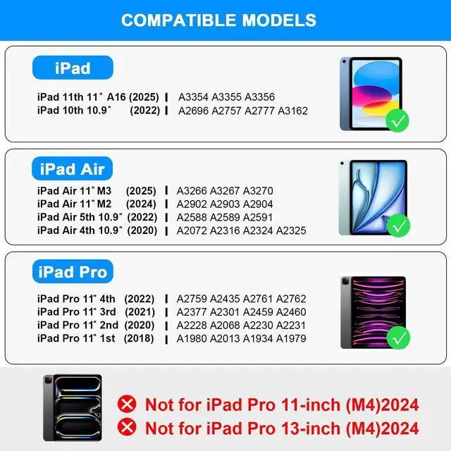 iPad case with keyboardCompatible with iPad A16 11th generation 11 inch 2025; iPad 10th generation 10.9 inch 2022; iPad Air 11 inch M3 2025; iPad Air 11 inch M2 2024; iPad Pro 11 inch 4th 2022; iPad Pro 11 inch 3rd 2021; iPad Pro 11 inch 2nd 2020; iPad Pro 11 inch 1st 2018; iPad Air 5th 10.9 inch 2022; iPad Air 4th 10.9 inch 2020. ^^ Built-in Touchpad The iPad 10th generation case with keyboard is equipped with a built-in touchpad, enabling users to operate the iPad effortlessly without a mouse.