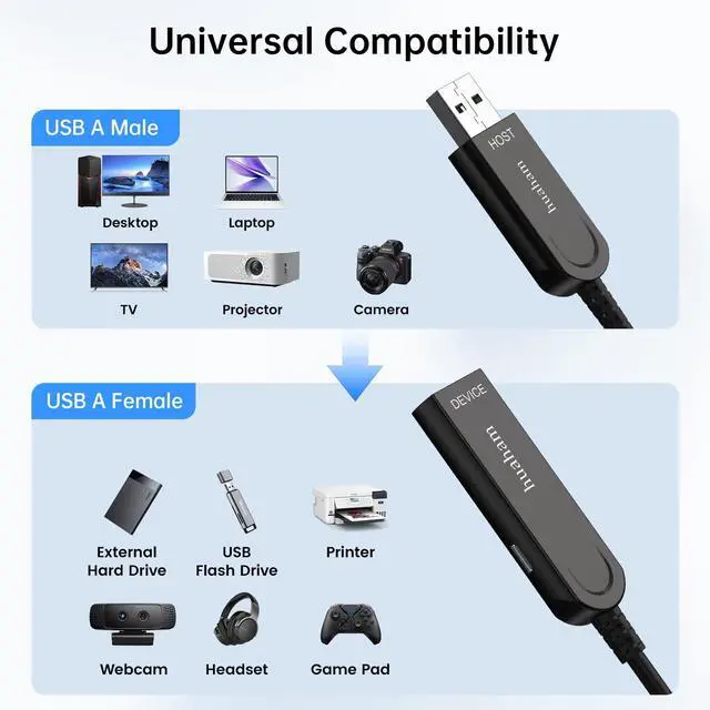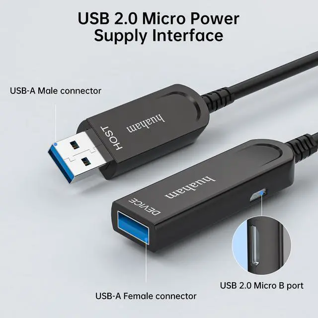 The cable outer diameter of 0.19 in can easily pass through tight pipes. It has passed at least 25, 000 90-degree bending tests. ^^ Unidirectional TransmissionUSB A to USB A Fiber Optic Cable only supports one-way transmission, not bidirectional transmission. Must be connected from "Host" connector (for connecting computers, consoles, etc. ) to "Device" connector (for VR devices, HDD, webcams, etc. ). ^^ Power Assist FunctionUSB extension type A female connector with USB 2.0 Micro-B interface can power the device up to 5V2A/10W. It integrates charging and data transmission, without the need for additional cable power.